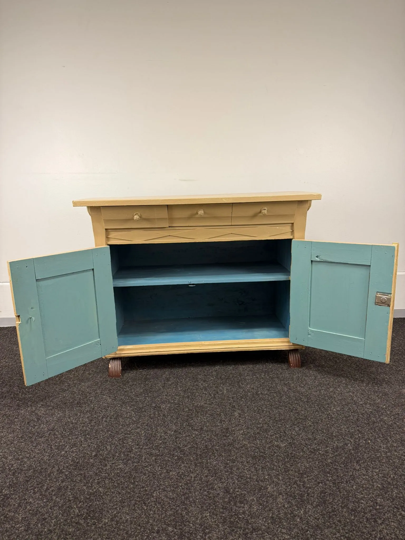 Iänmukaista kulumaa, myöhempi maalipinta, sivusta yksi pala pois kuvan mukaisesti, ei avainta.