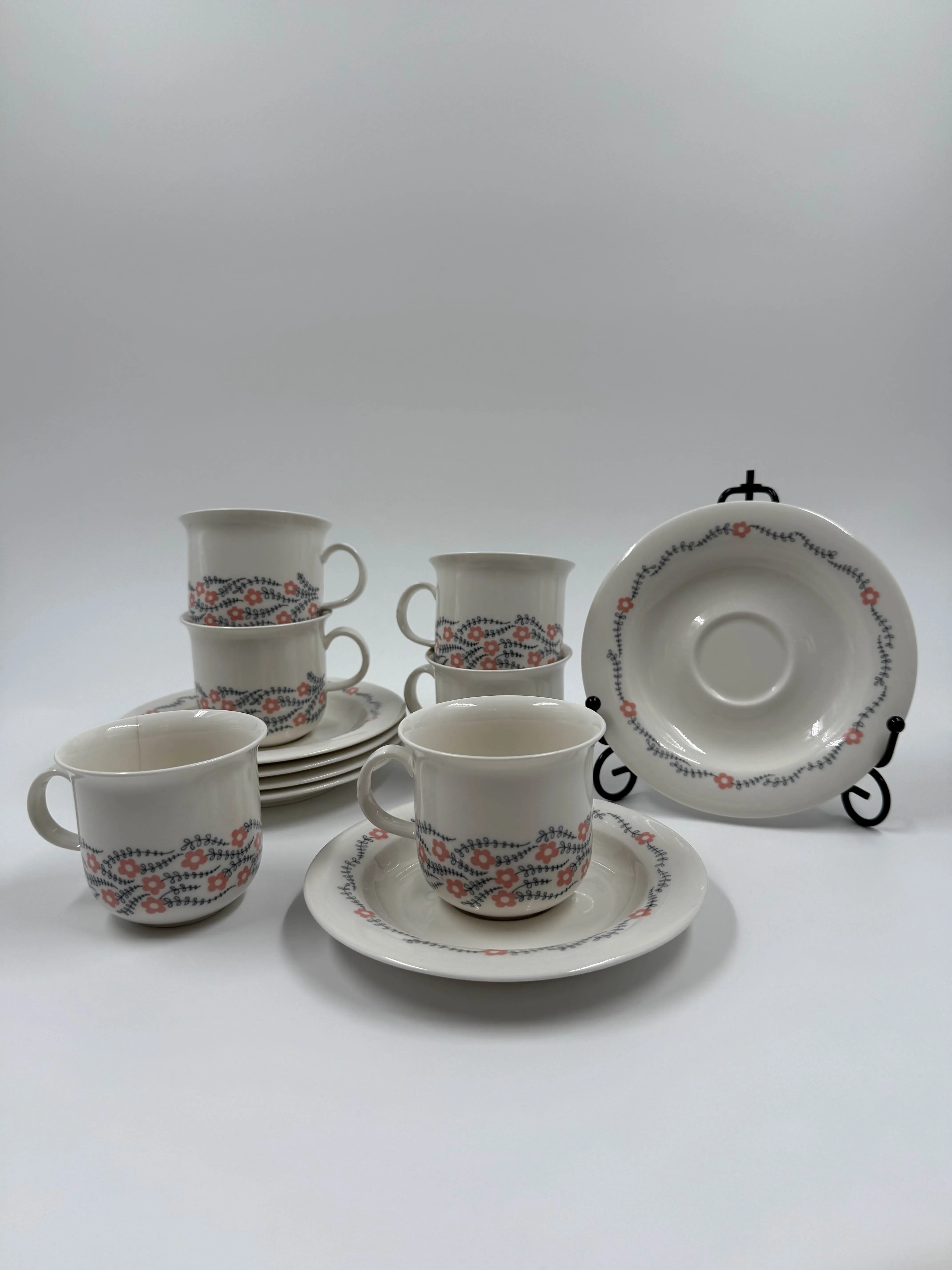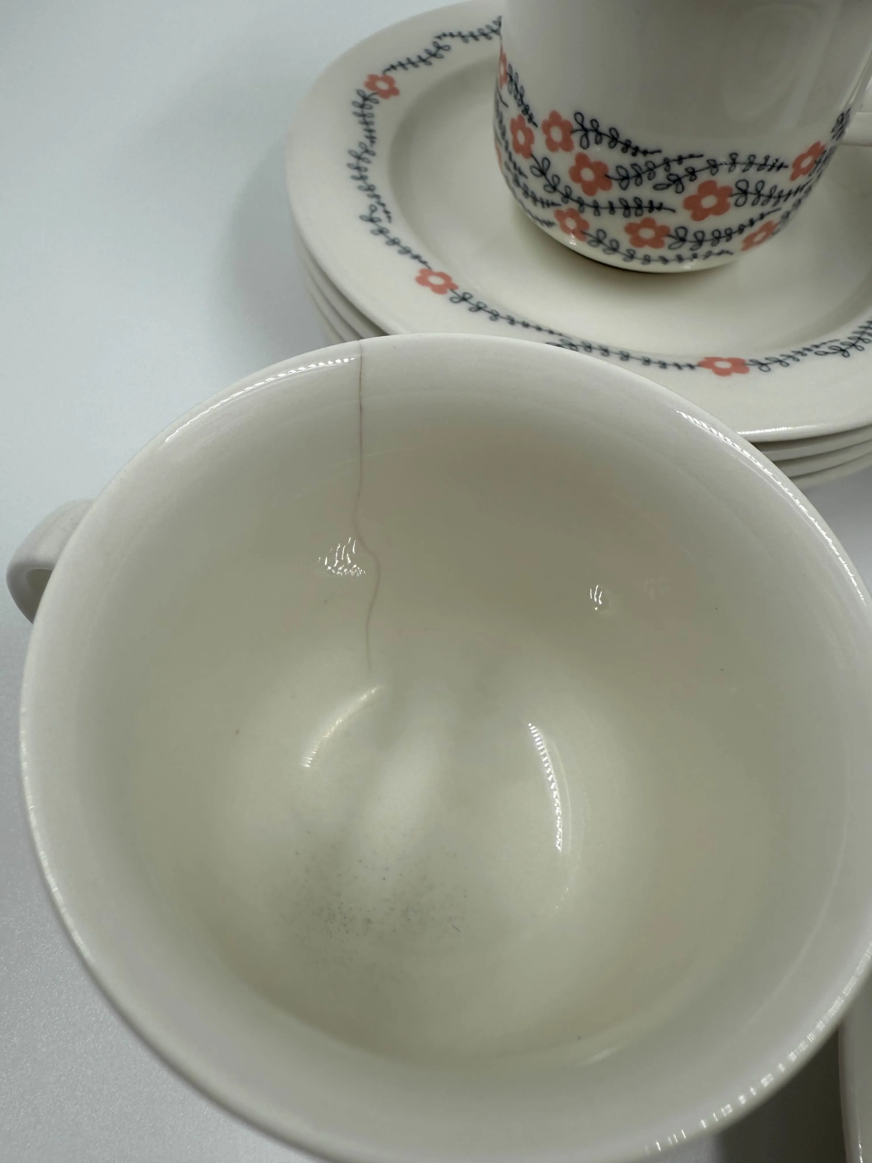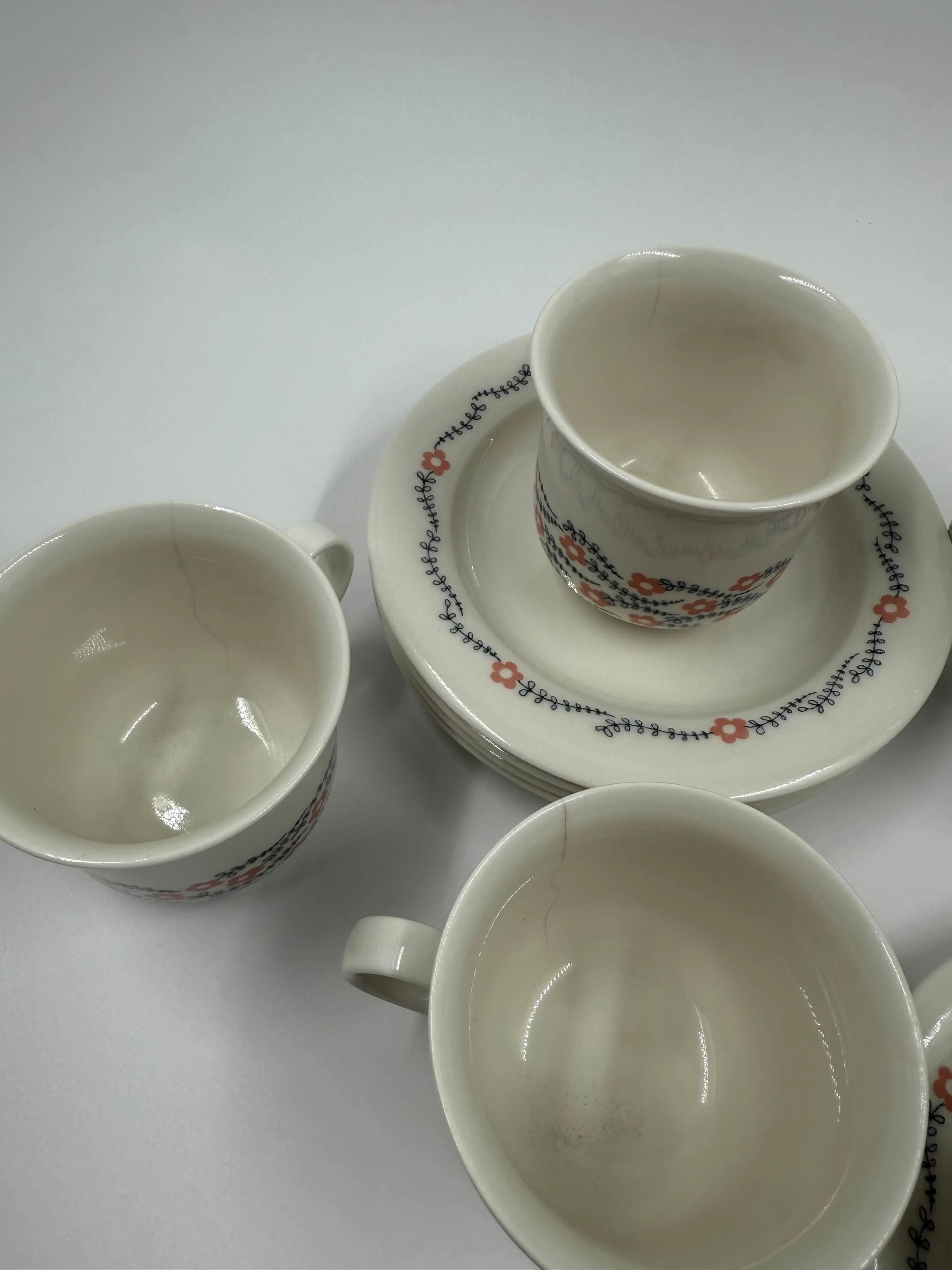 6+6, kolmessa kupissa halkeama, kulumaa kuppien sisäpuolella.