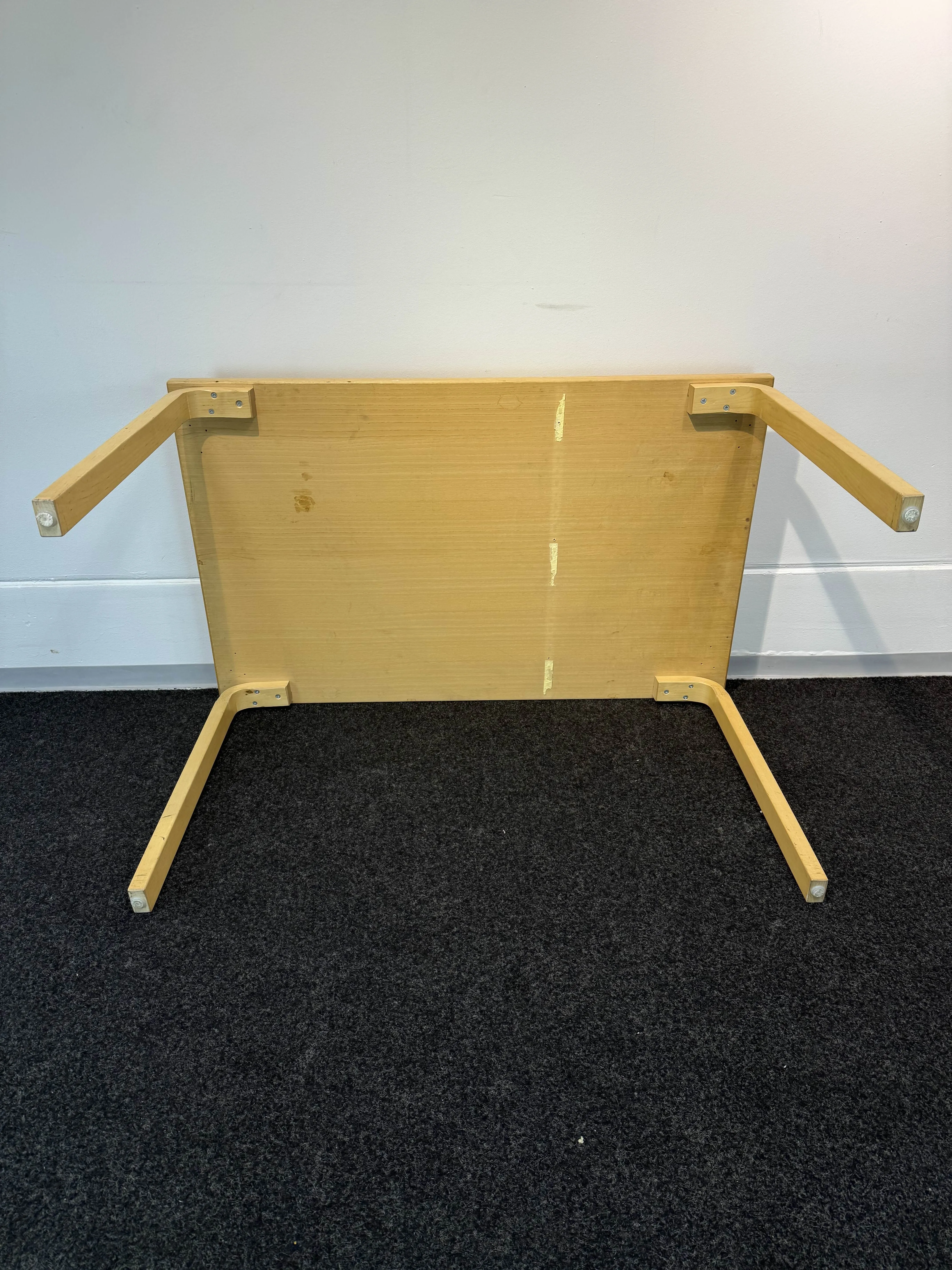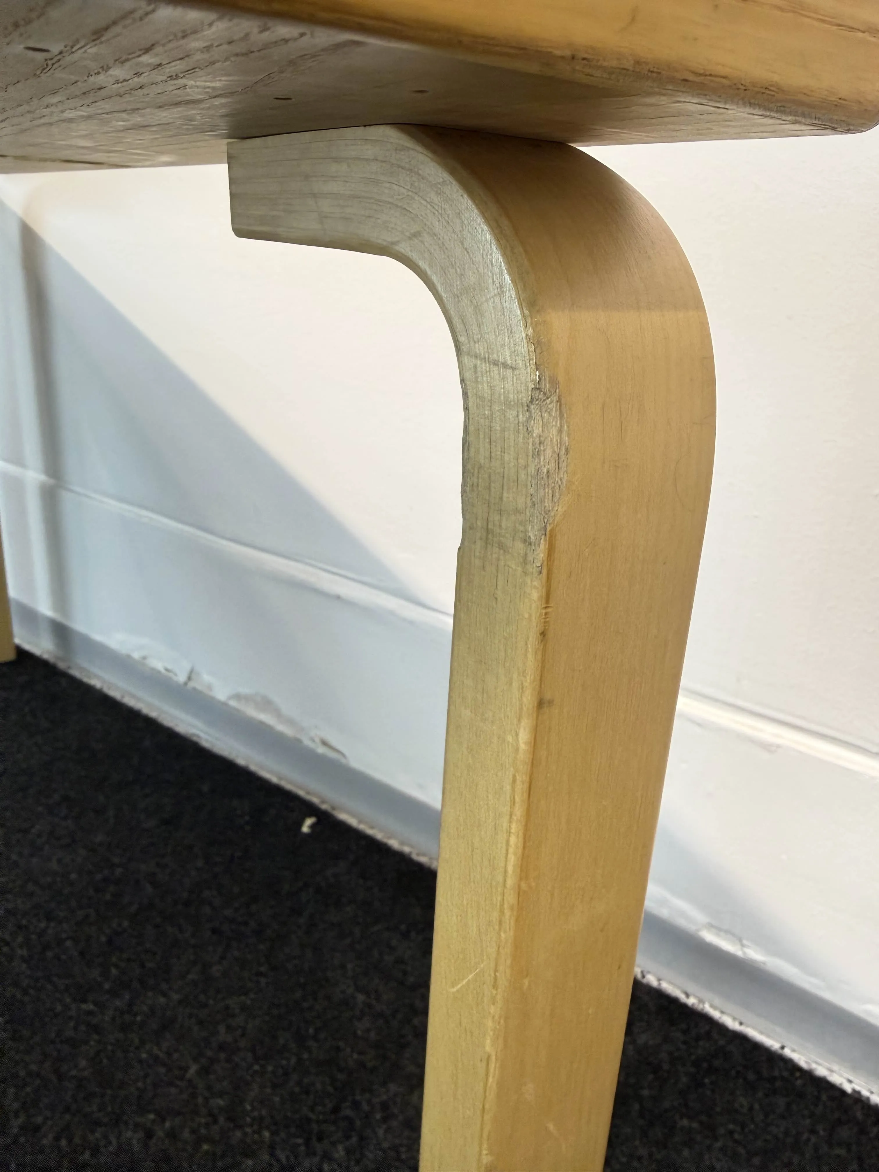 Käyttökulumaa, paikoittain runsaampaa kulumaa. Kaikissa jaloissa jälkiä tuolien aiheuttamista iskuista. Paikat jaloille kumminkin päin. Jälkiä tarroista ja kiinnityksistä.