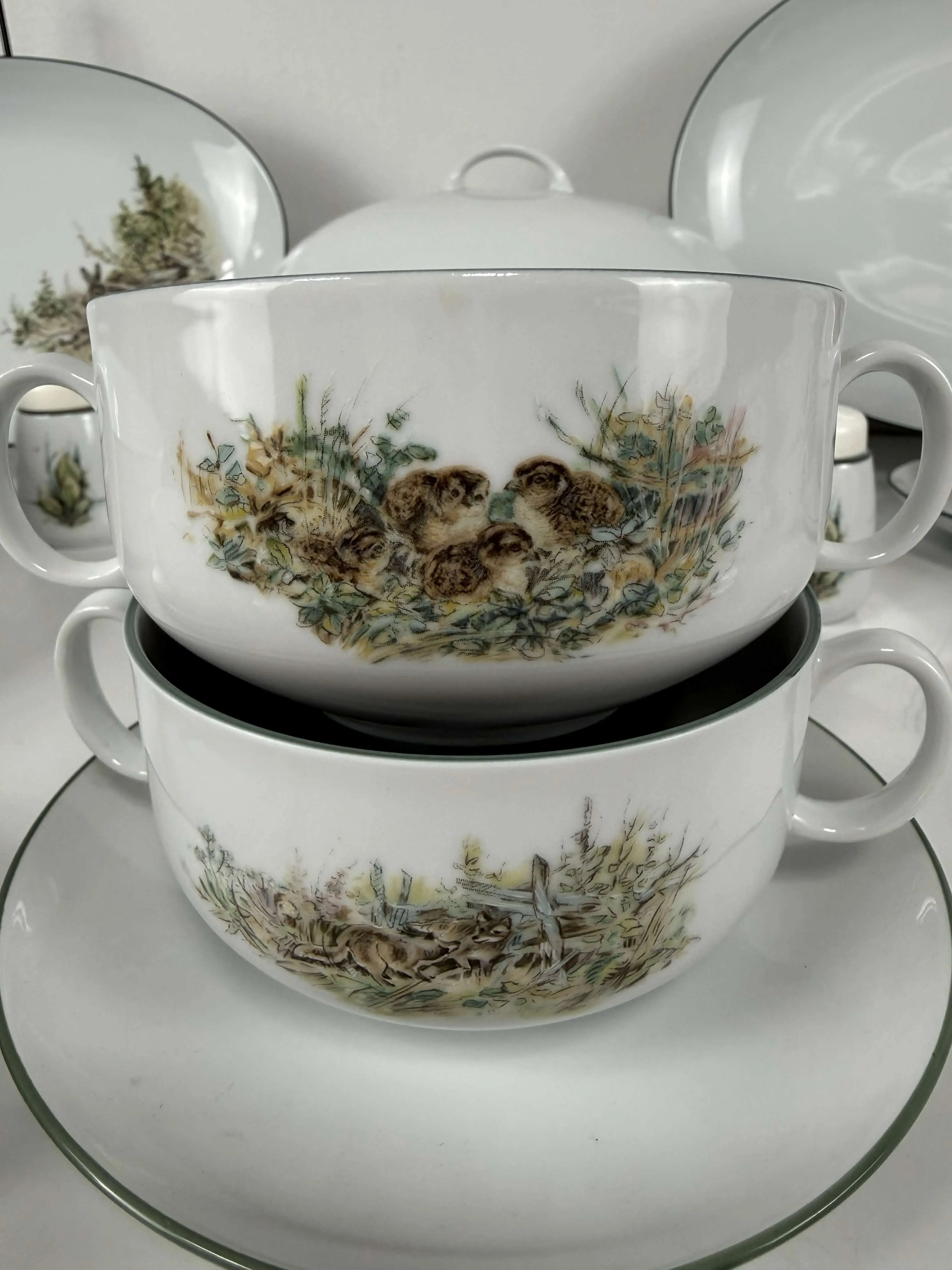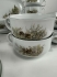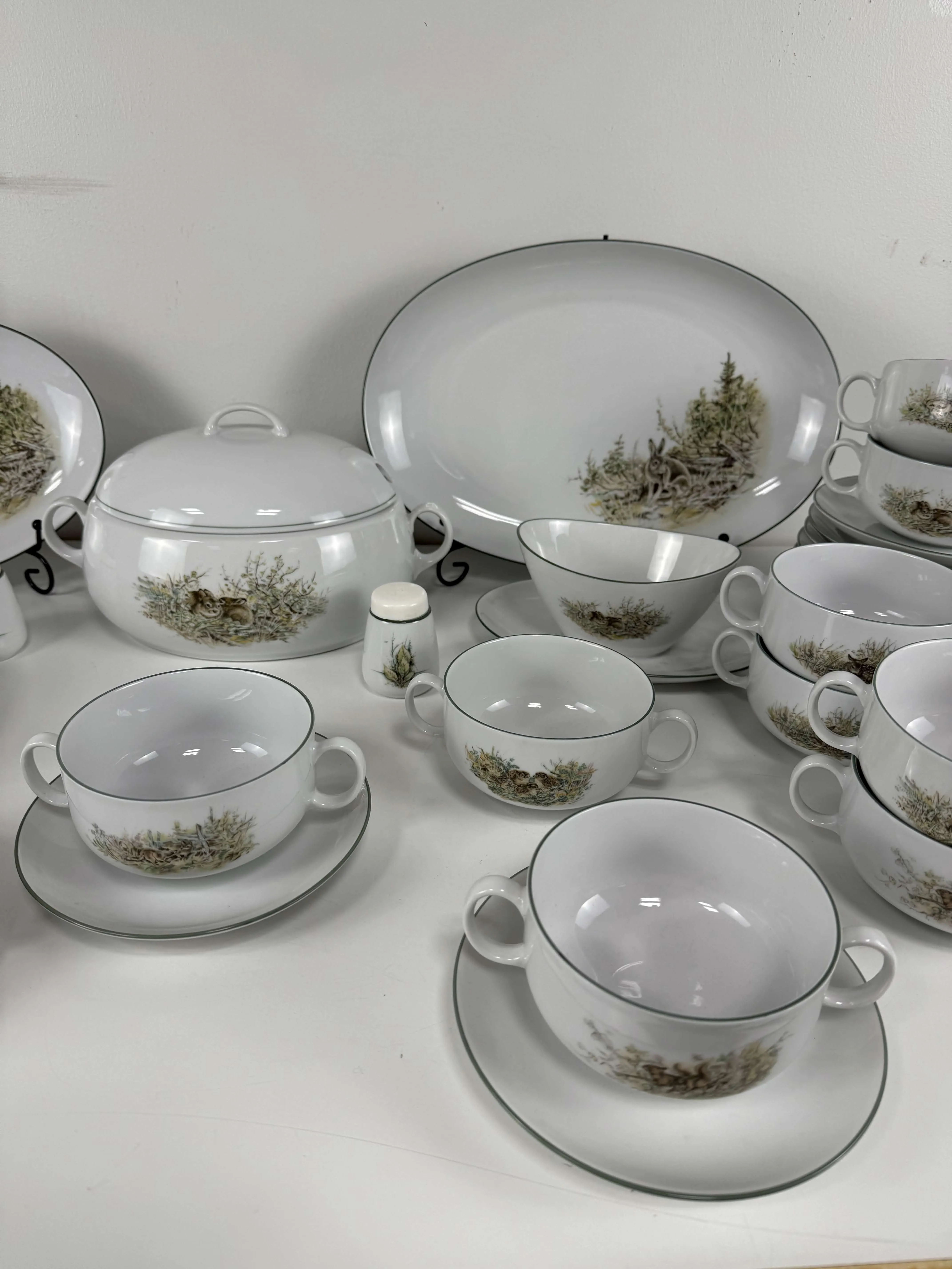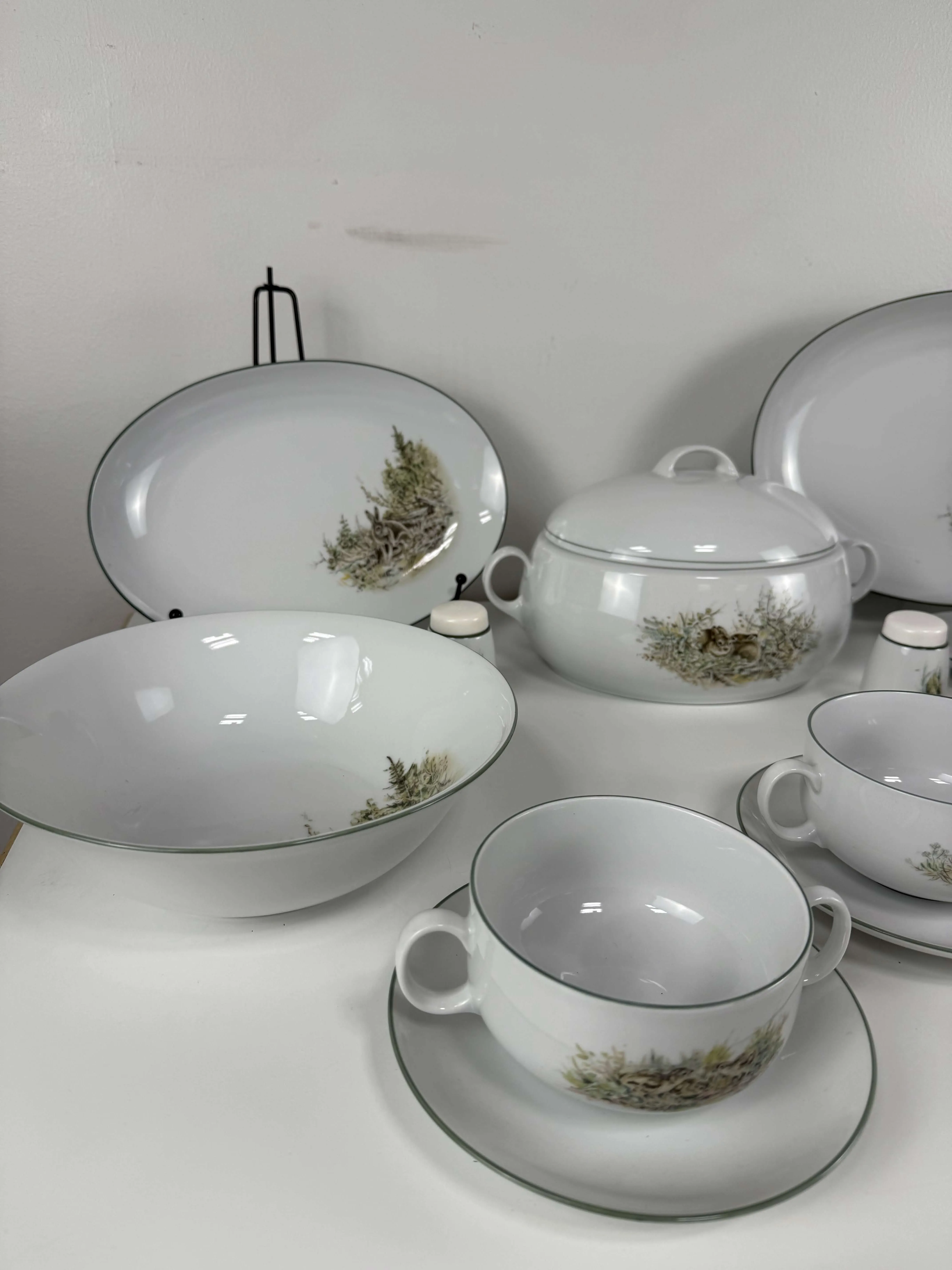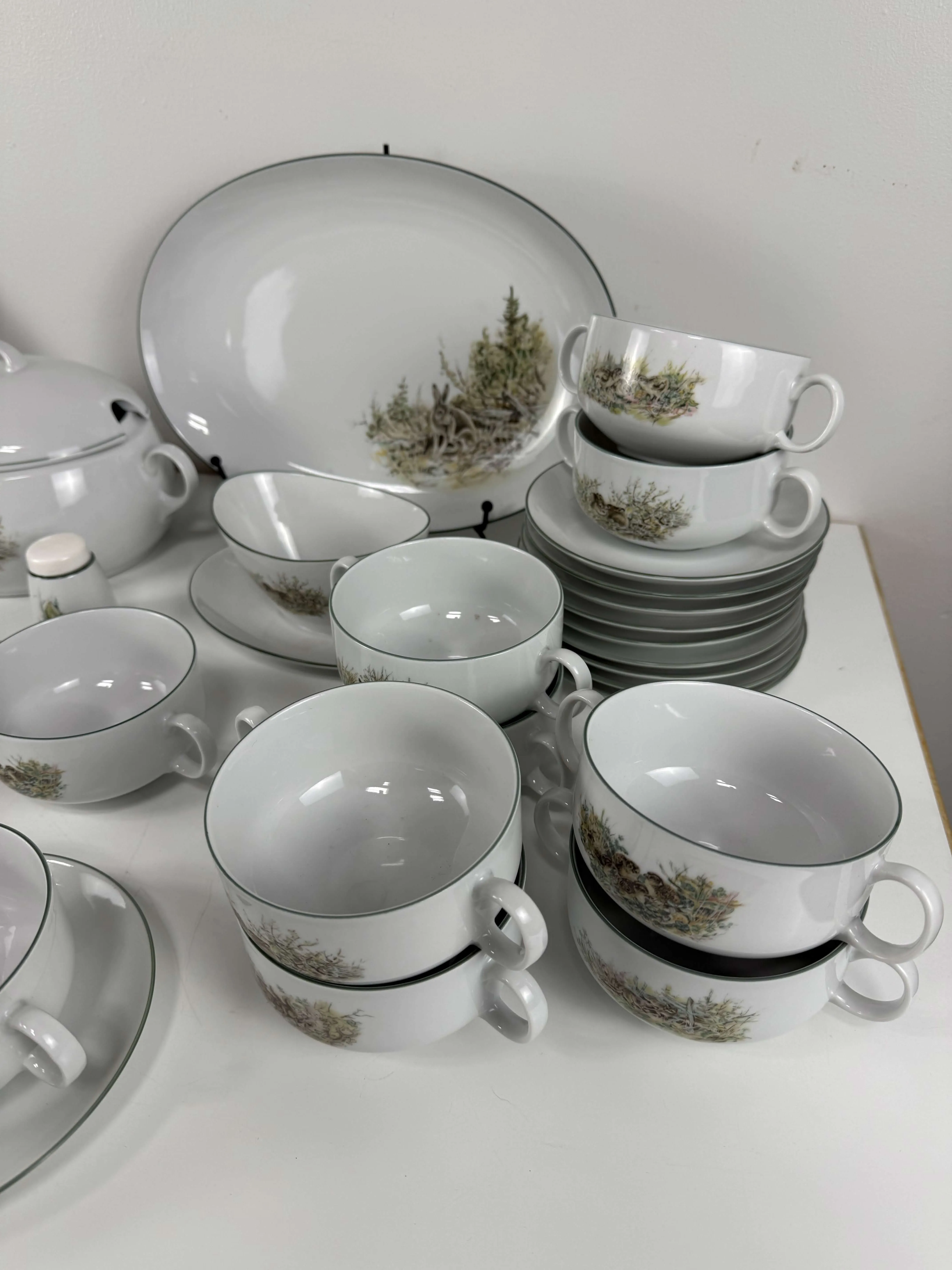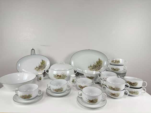 12 teekuppiparia, kaksi tarjoilulautasta, soppakulho, syvä tarjoiluastia, liemikulho, suola ja pippurisirottimet.