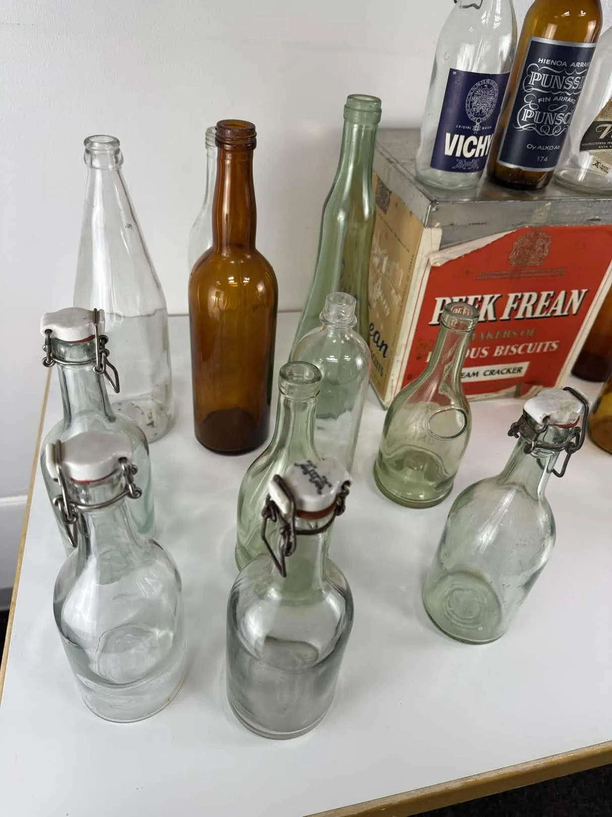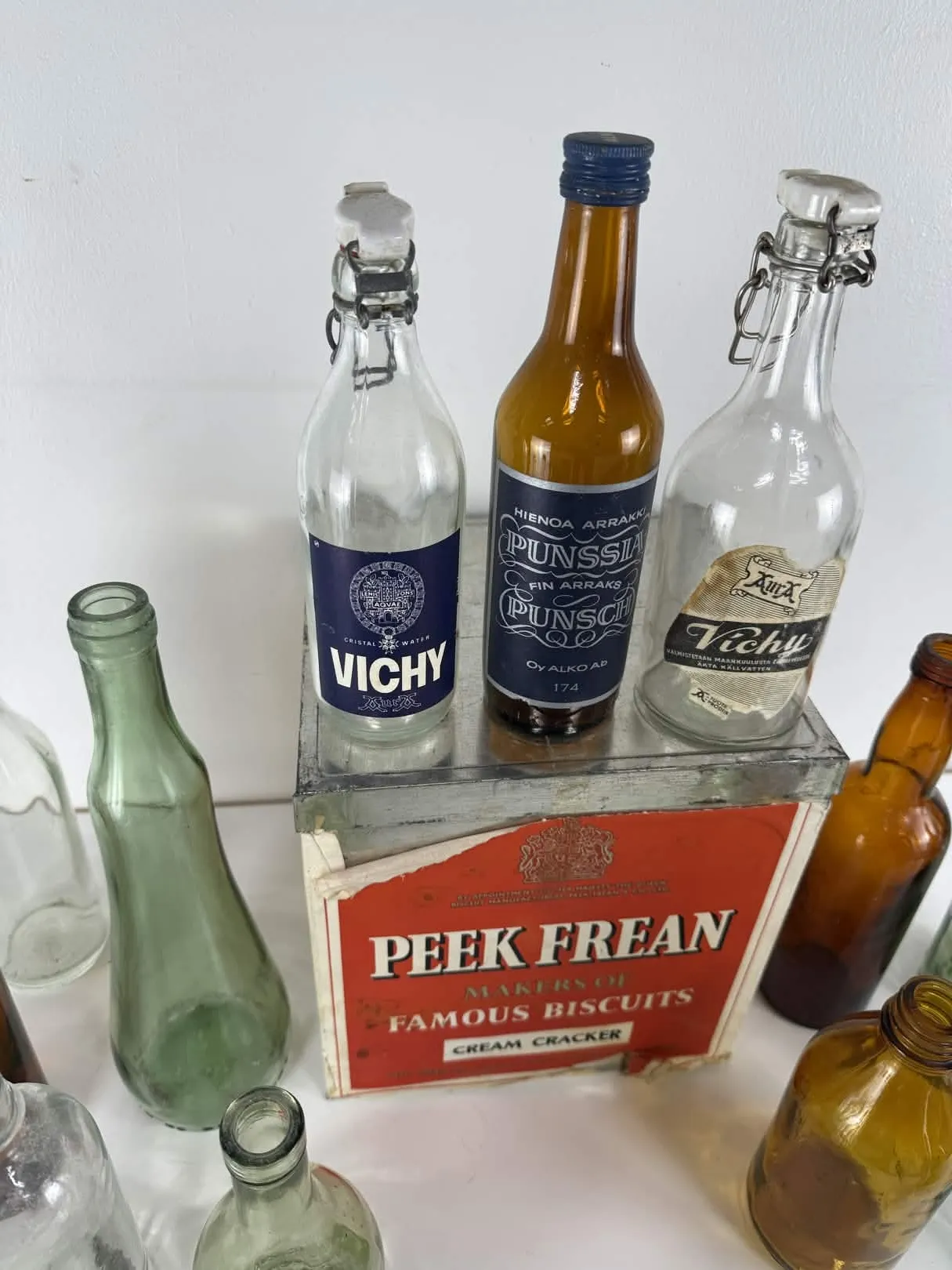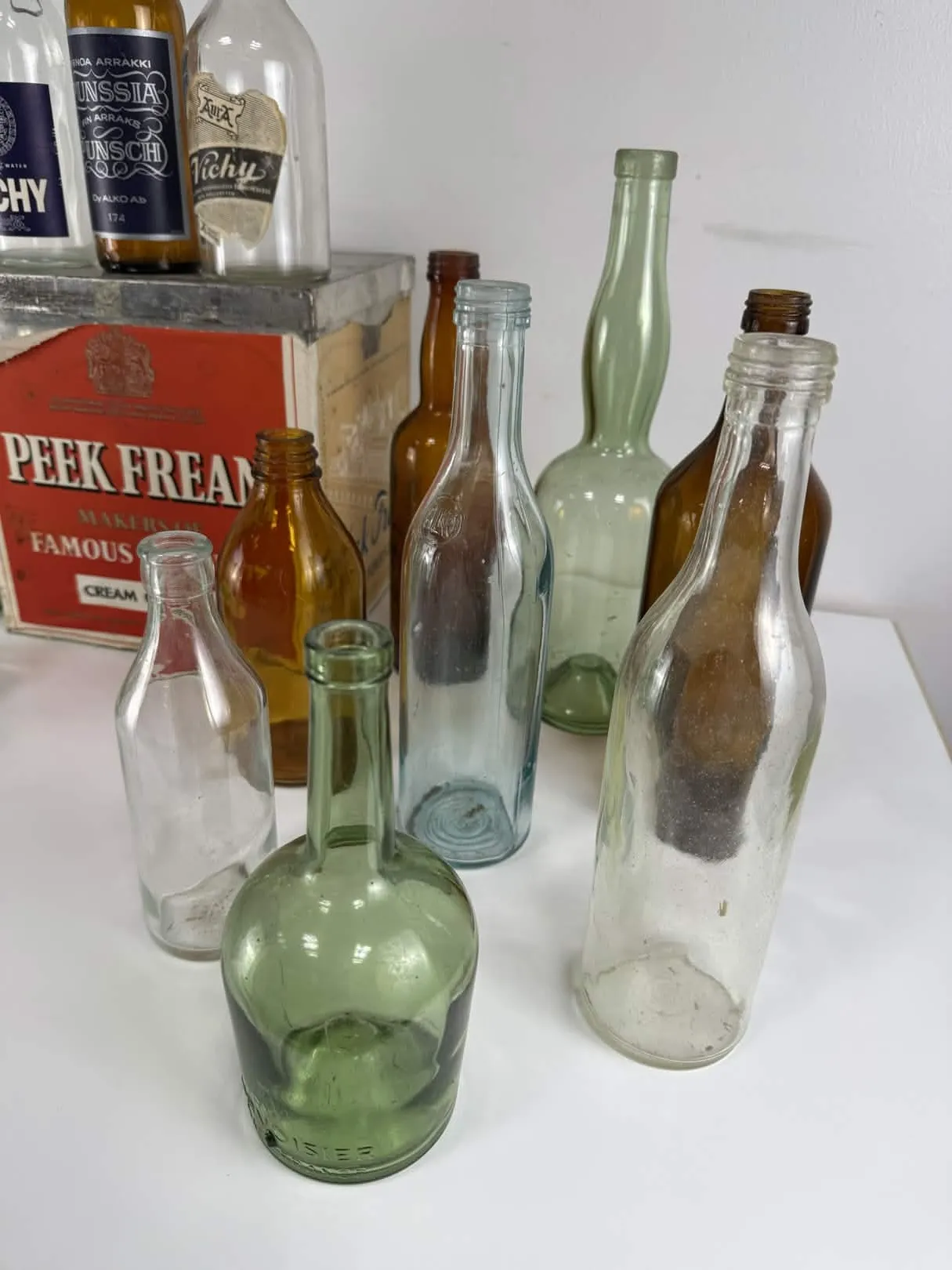 Laatikossa runsasta kulumaa, pullot ok-kuntoisia.