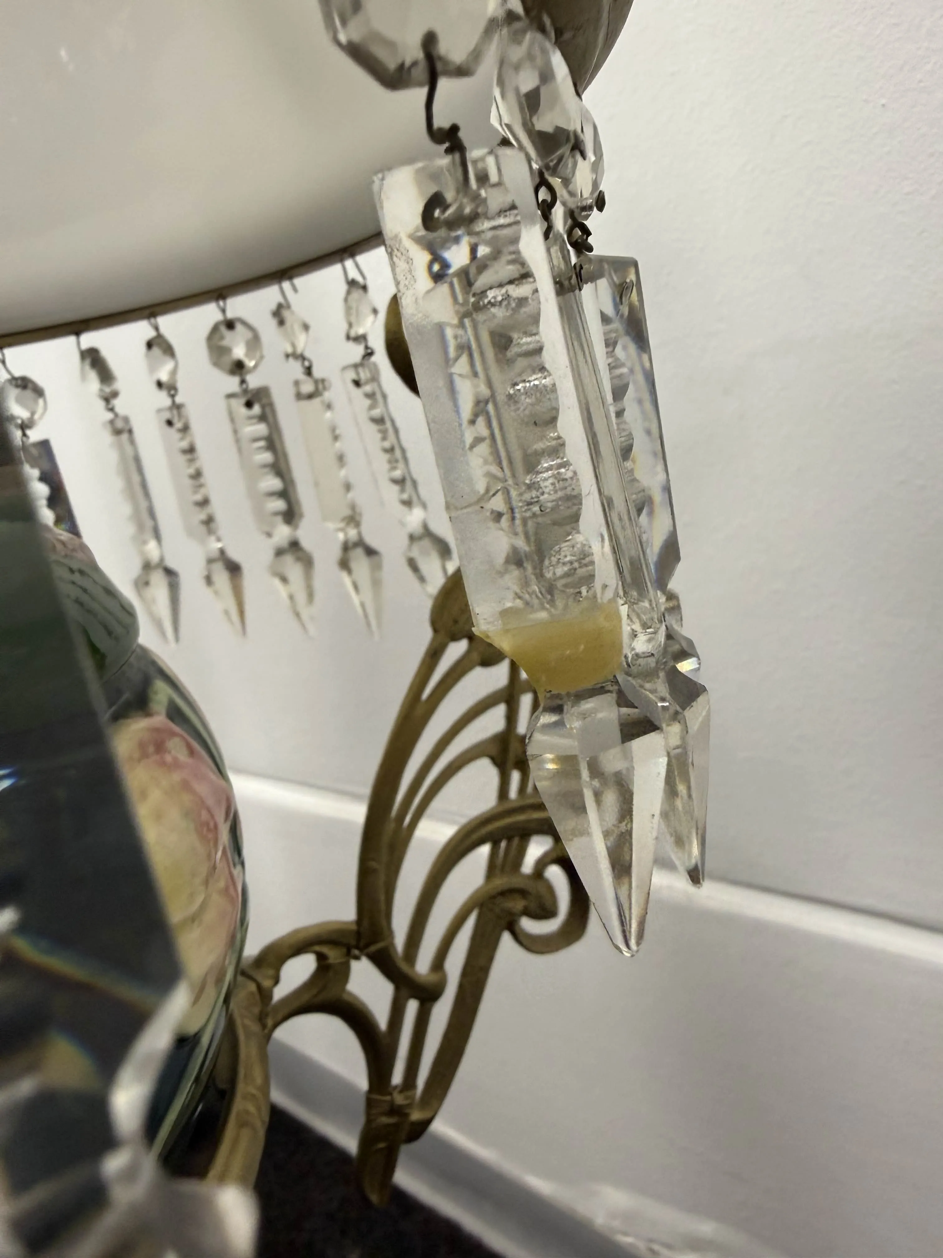 Iänmukaista kulumaa. Yksi kristalli puuttuu, yksi kristalli liimattu, kuvussa pieni kolhu.
