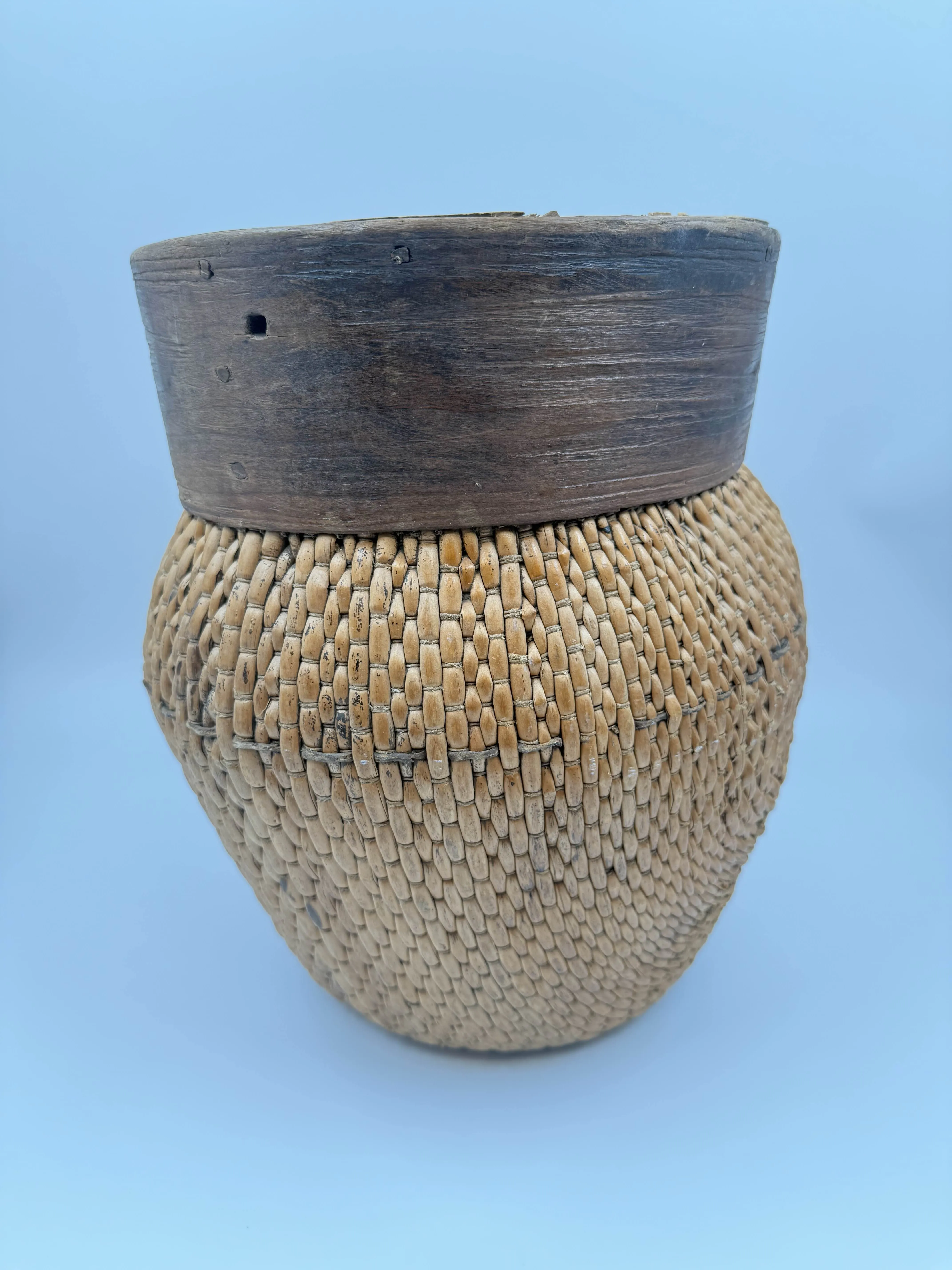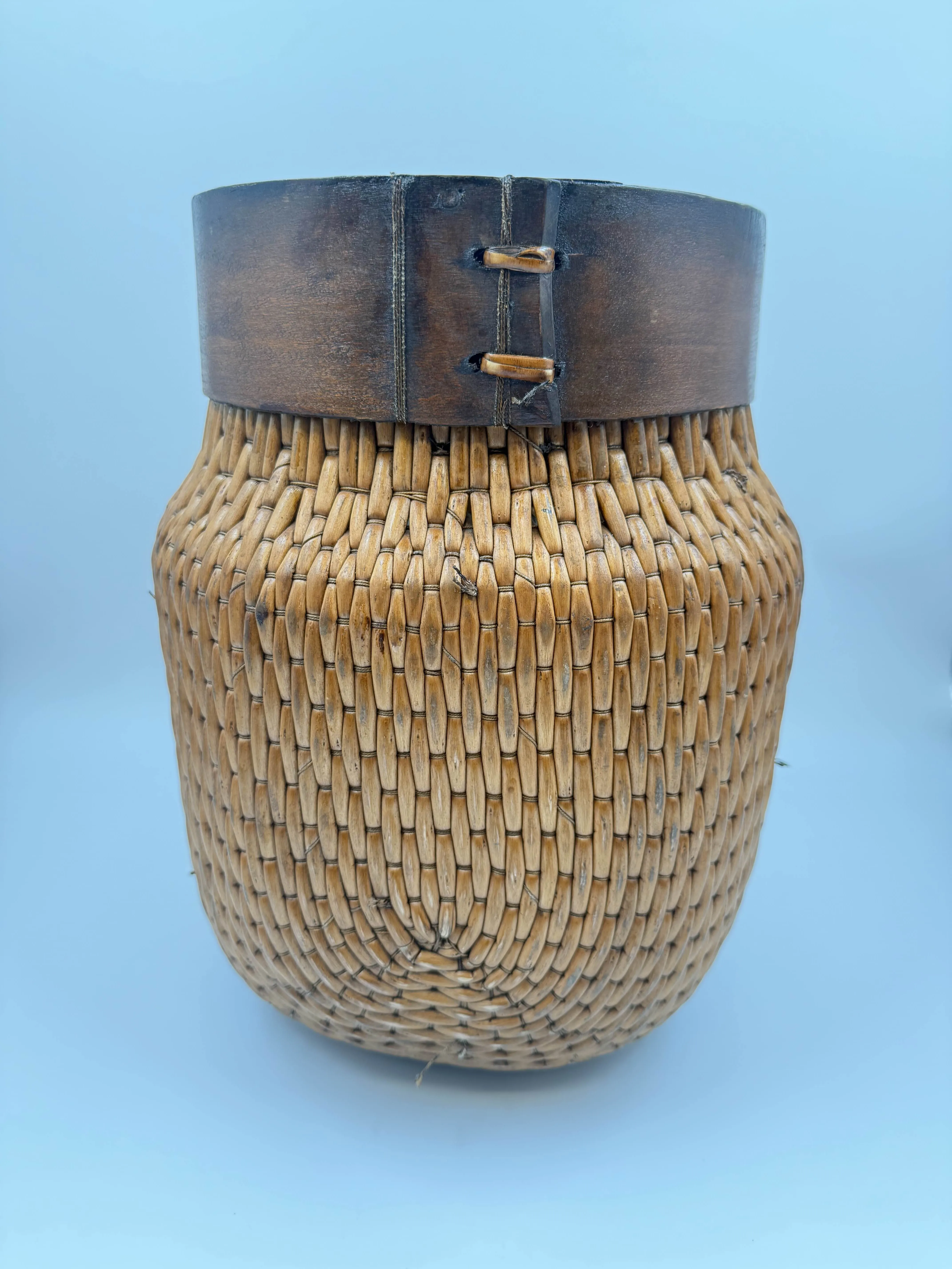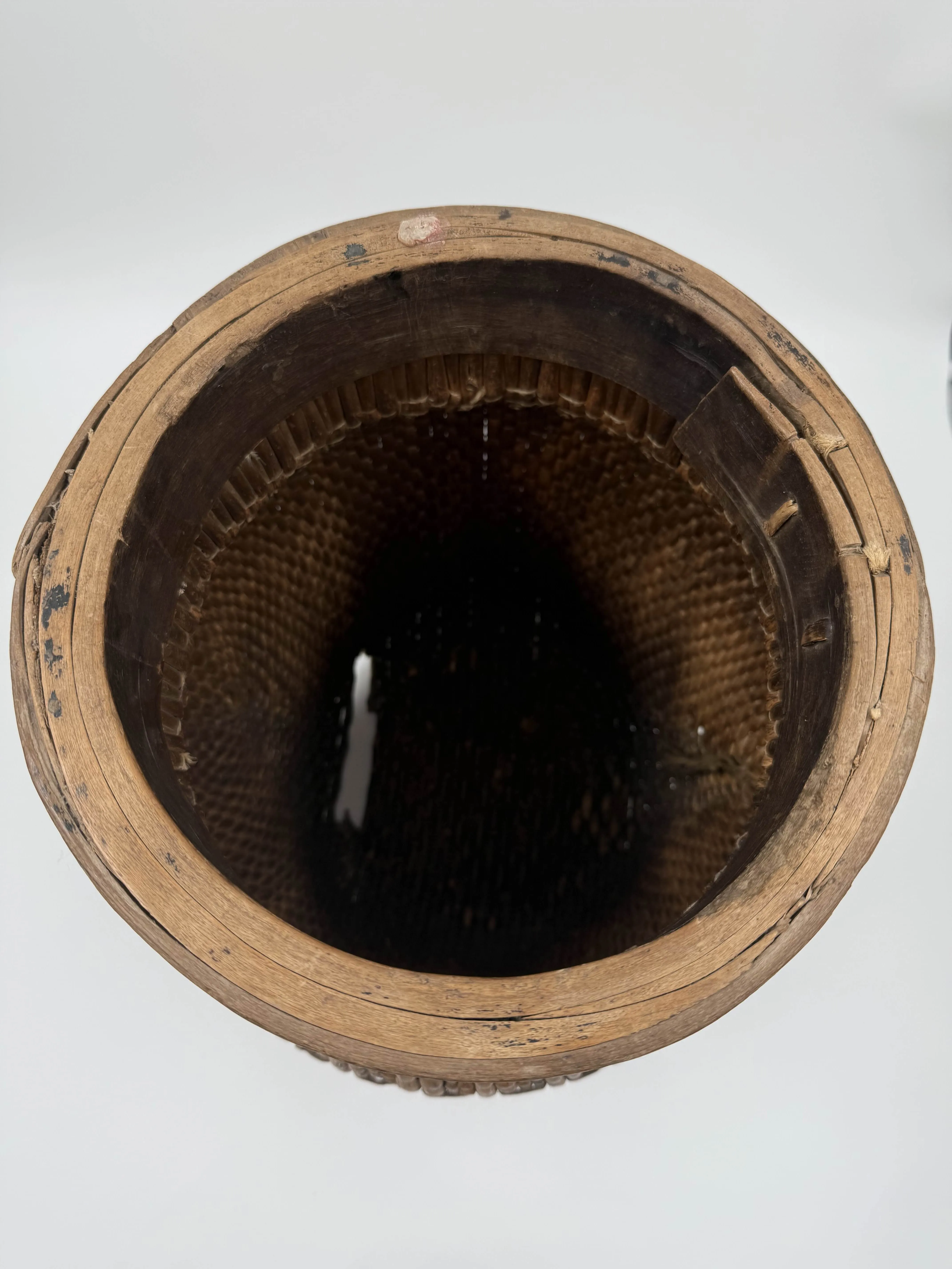 Pienemmän korin pohjassa reikä. Muuten iänmukaista kulumaa.