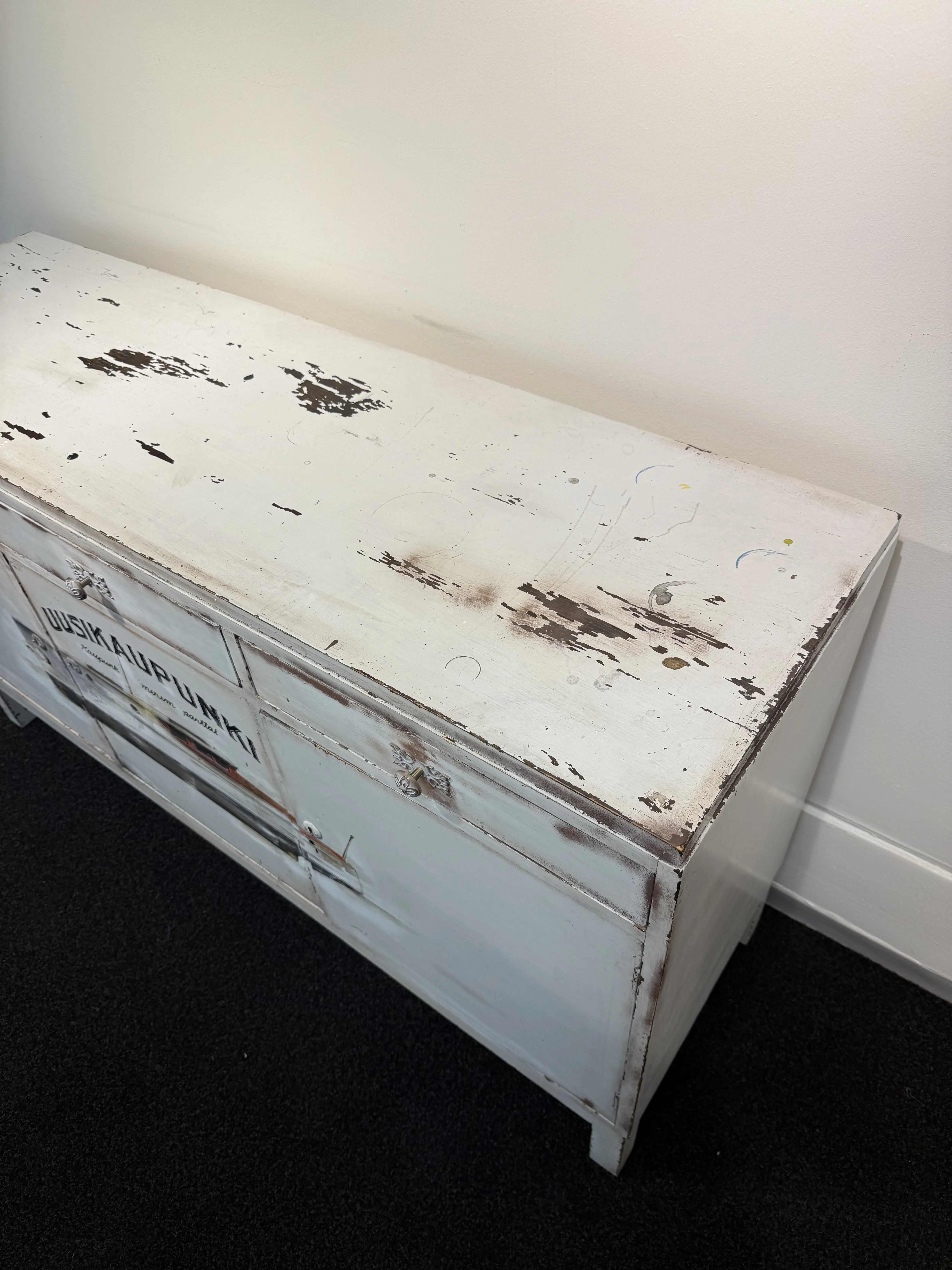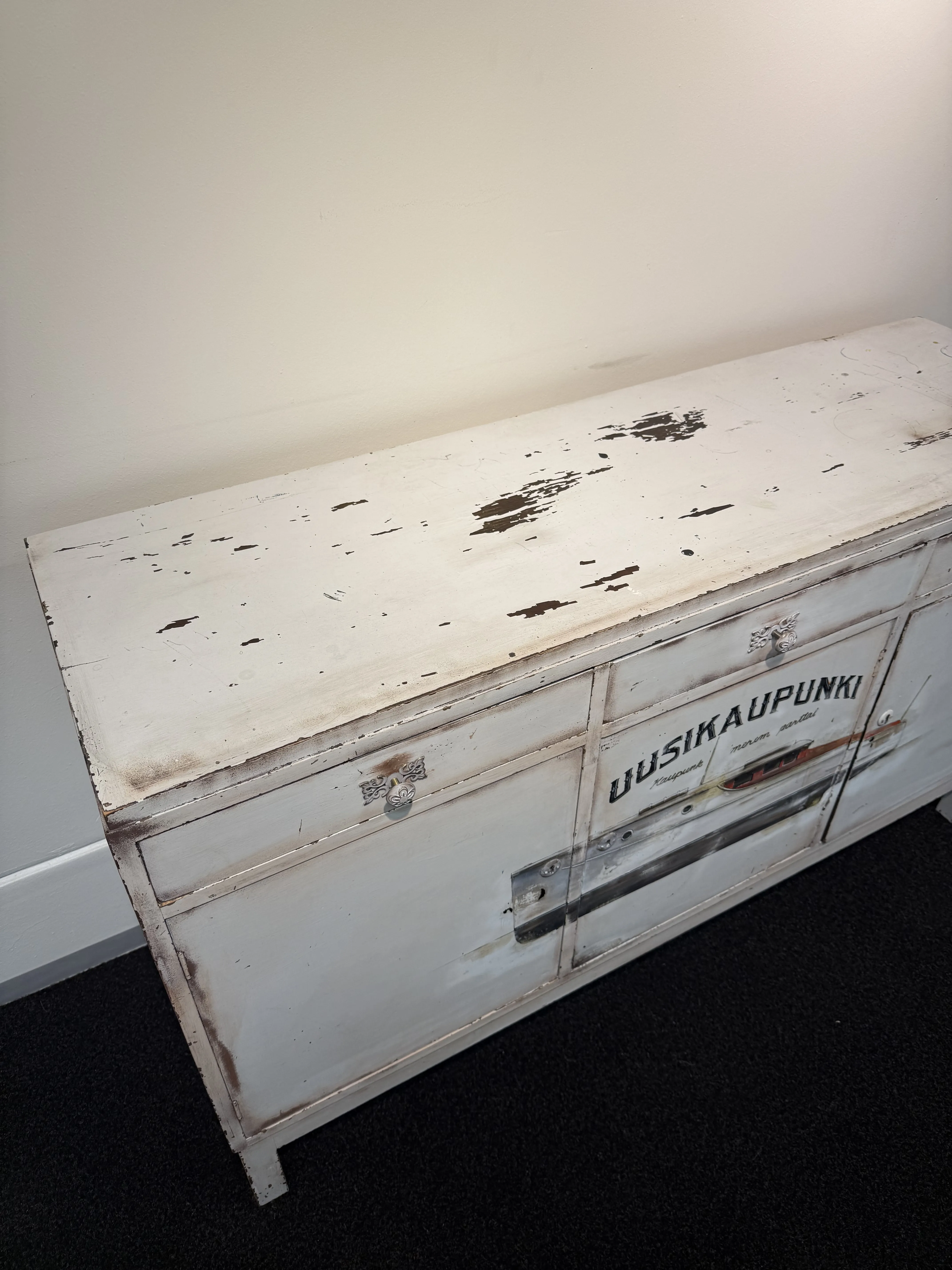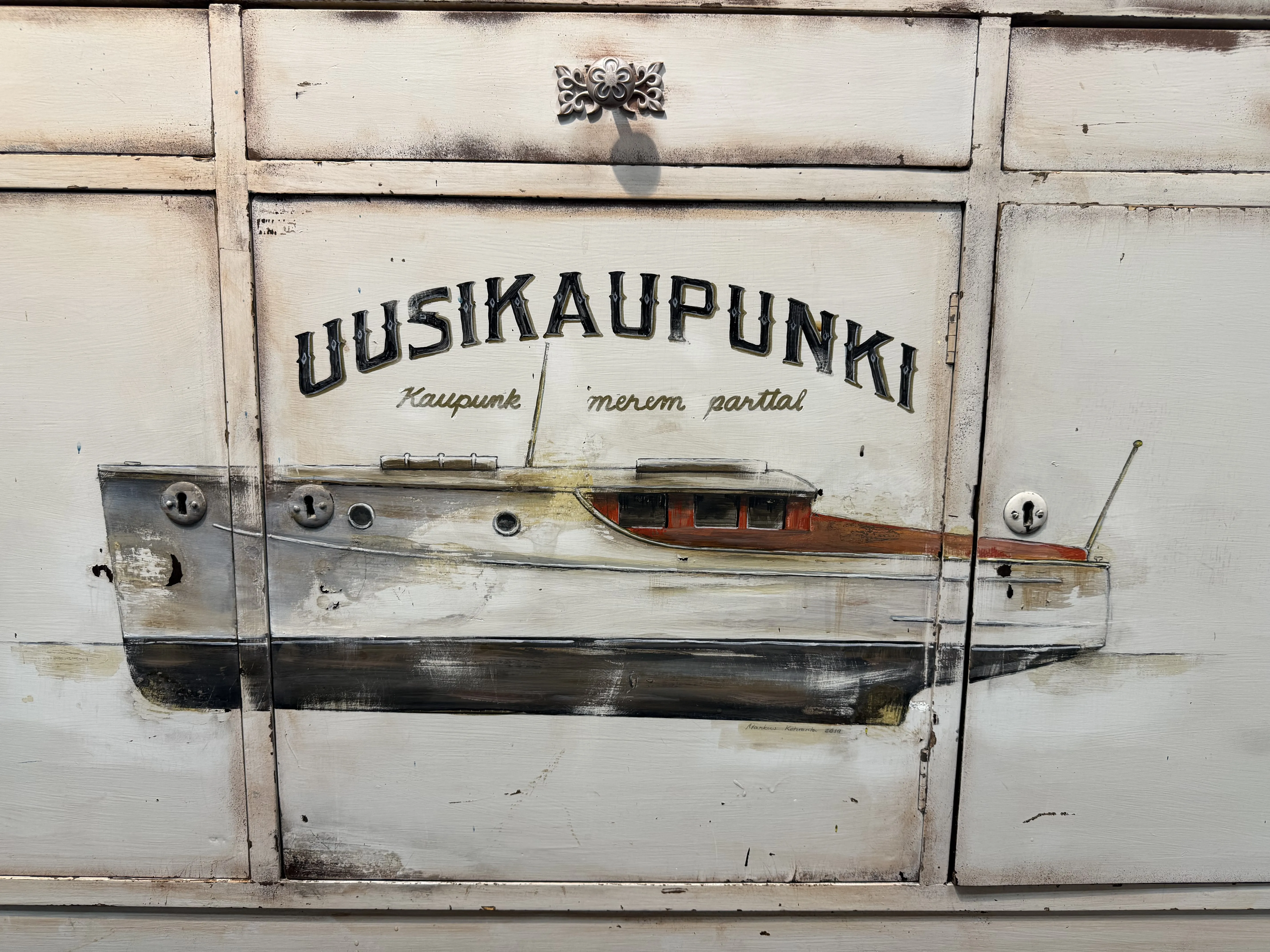 Merelliseen aiheeseen maalattu "Uusikaupunki" senkki. Senkissä kaksi avainta, jotka toimivat kaikkiin lukkoihin. Signeerattu Markus Kotiranta 2019.